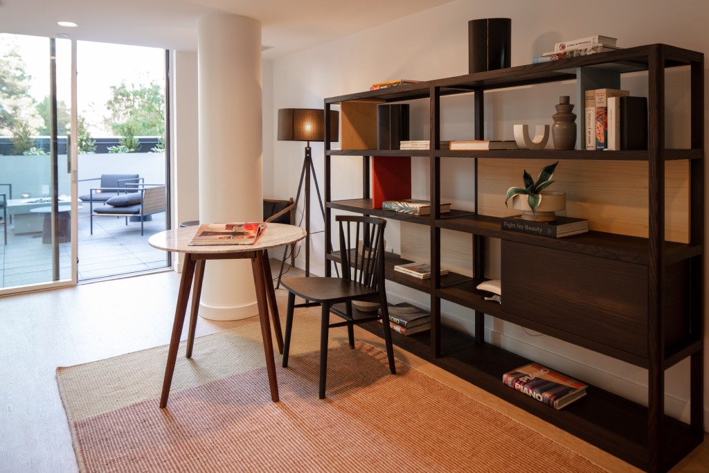 An extensive common outdoor space fills the west side of the level 3 terrace, creating an urban sanctuary with bench seating and an outdoor dining area equipped with BBQ’s surrounded by lush planters, a fire pit, and Japanese landscaping. A quiet outdoor patio adjacent to the level 3 library extends residents’ living space, creating opportunities for social interaction and community-building. A landscaped terrace common area on level 4 joins the two towers above the podium with an outdoor play area for children with integrated rubberized play spaces and a rope forest, adjacent to the yoga pavilion with full height windows, connected to the building’s gym below.