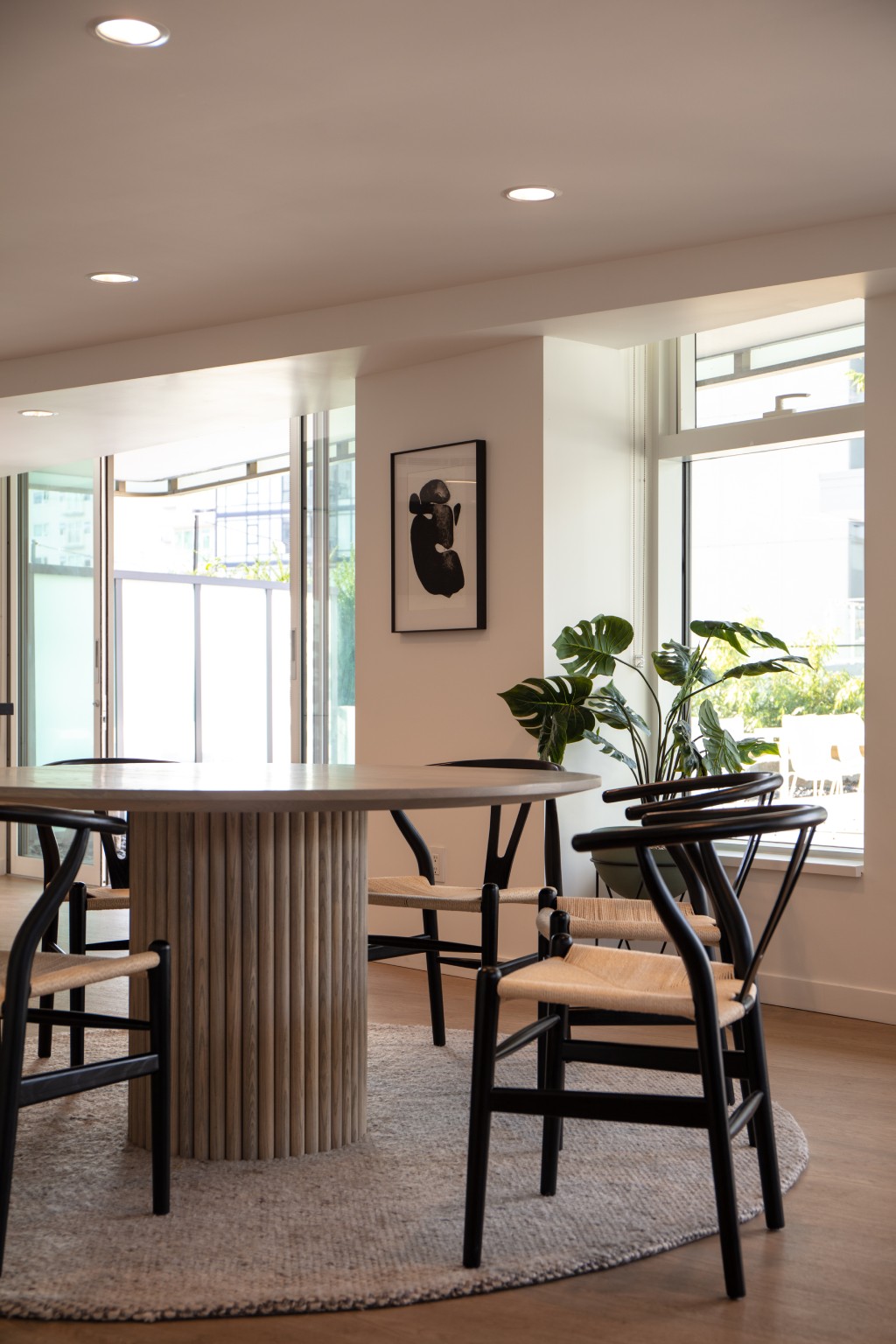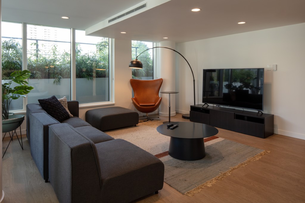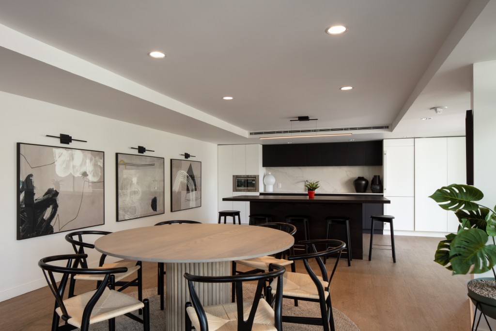 The building includes a significant indoor amenity room suitable for large gatherings and events on level 3, connected to the outdoor terrace. This space has a fully equipped kitchen, dining and lounge areas, and study rooms.