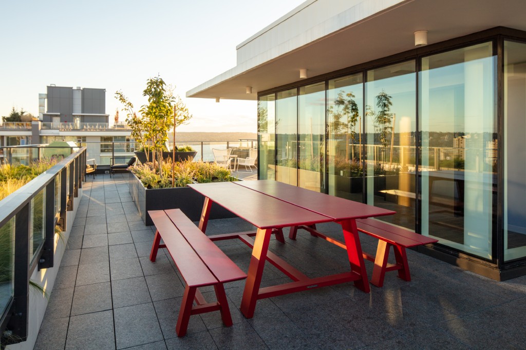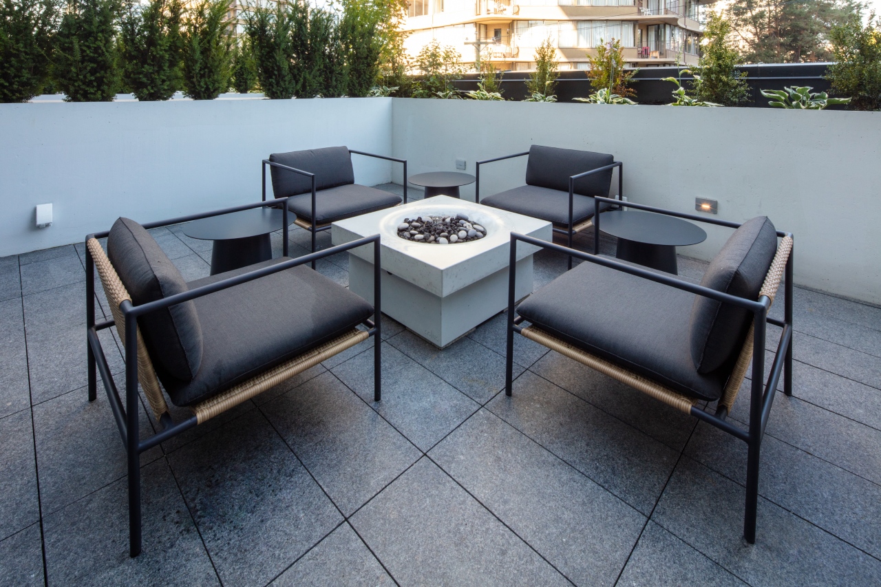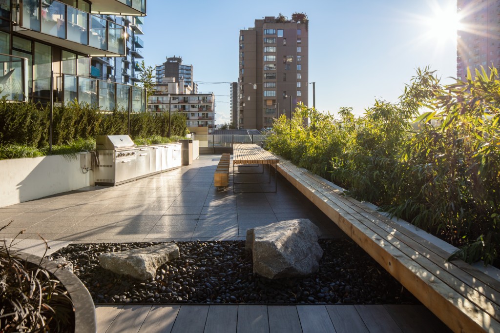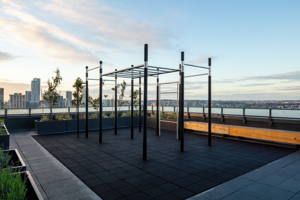 The rooftop levels of both towers offer panoramic views of English Bay, Stanley Park and downtown Vancouver. The rooftops include community garden planters for the use of building residents as well as seating and dining areas for events and activities, with a BBQ and fire pit. There will also be outdoor gym equipment on the top of both towers.